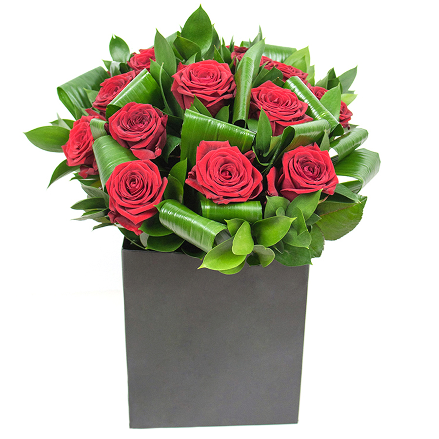 Our Stunning Red Roses & Greenery Bouquet is a perfect blend of vibrant red roses, fresh aspidistra leaves, and lush ruscus. This unique arrangement adds style and elegance to any setting.