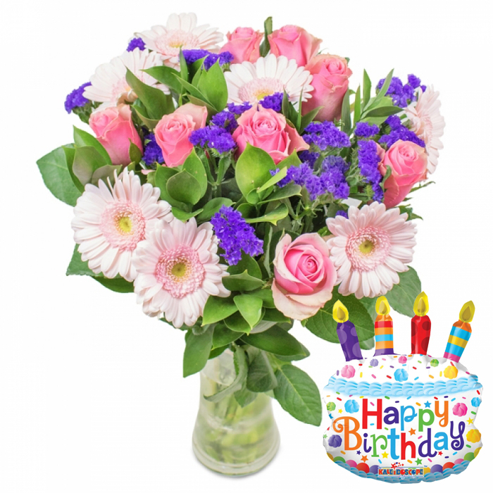 Make their birthday extra special with our vibrant floral arrangement featuring a harmonious mix of pink roses, pink germinis, and statice flowers. This unique bouquet is designed to captivate with its rich colors and elegant design, ensuring it stands out as a perfect gift for someone dear.